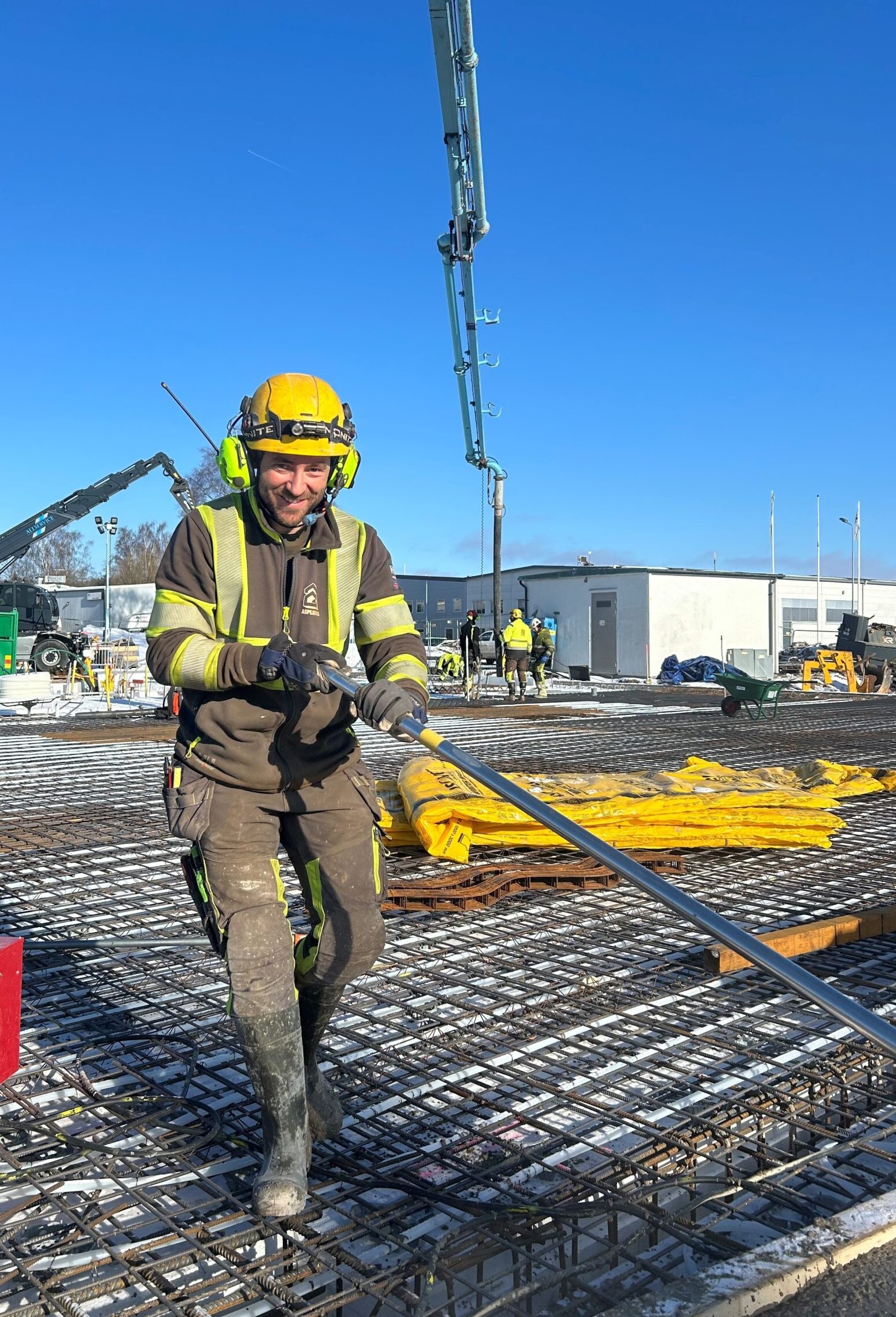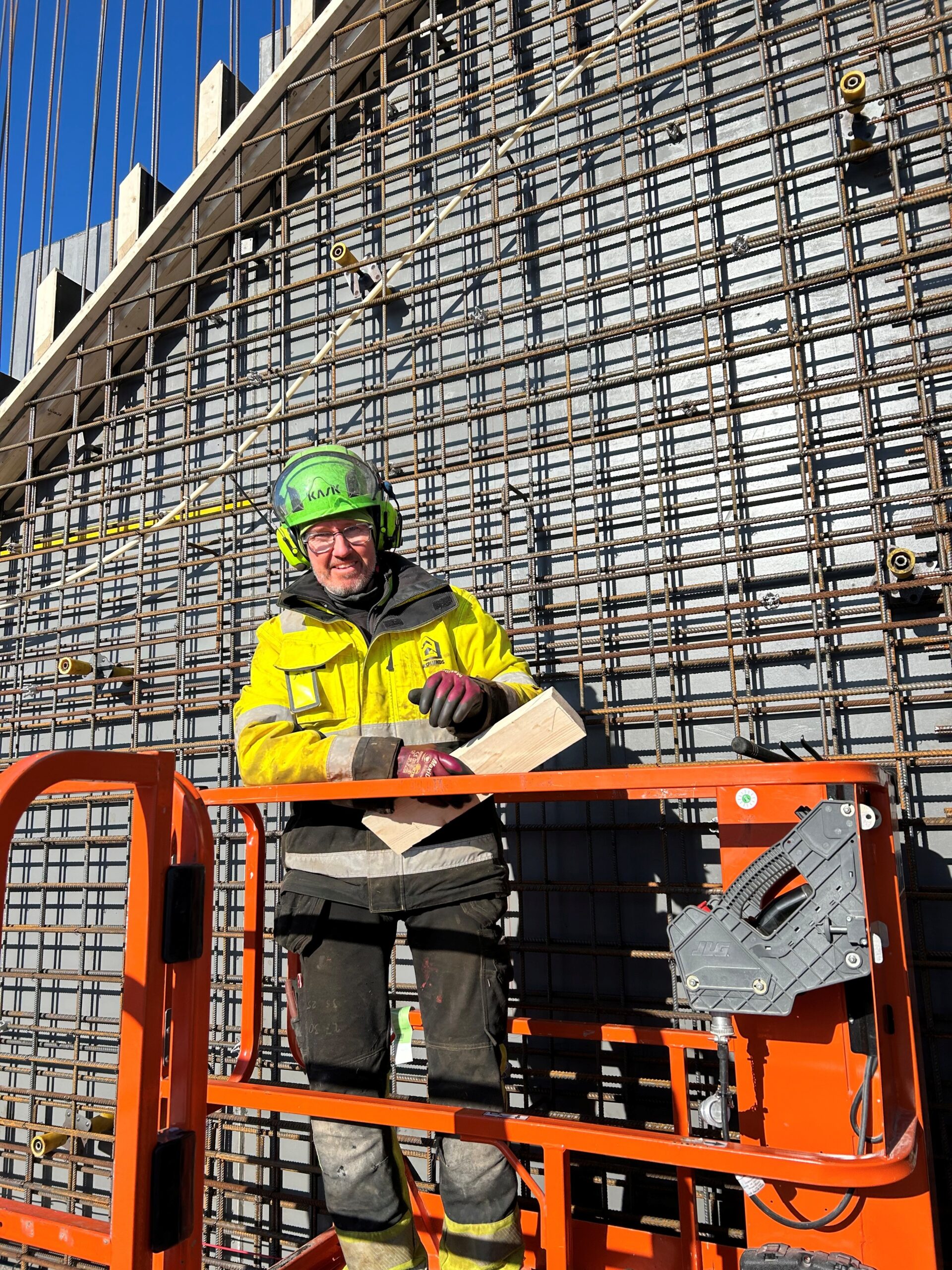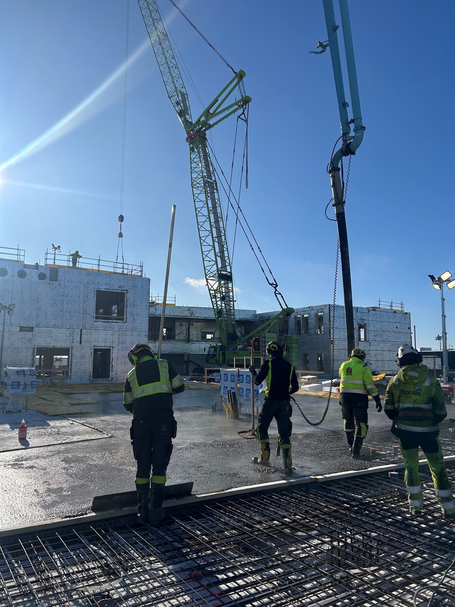 Det är hög energi under dagens arbeten på årets första riktigt soliga dag på Kv. Eldaren i Skövde Science City, nyproduktion av skola och bostäder. För tillfället pågår parallella arbeten med form- och gjutningsarbeten, armering av skyddsrum samt montage av prefab betongstomme.