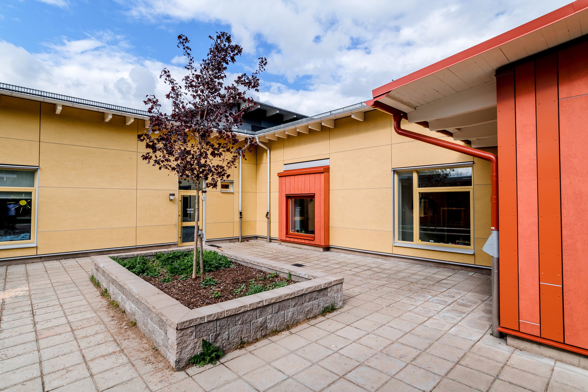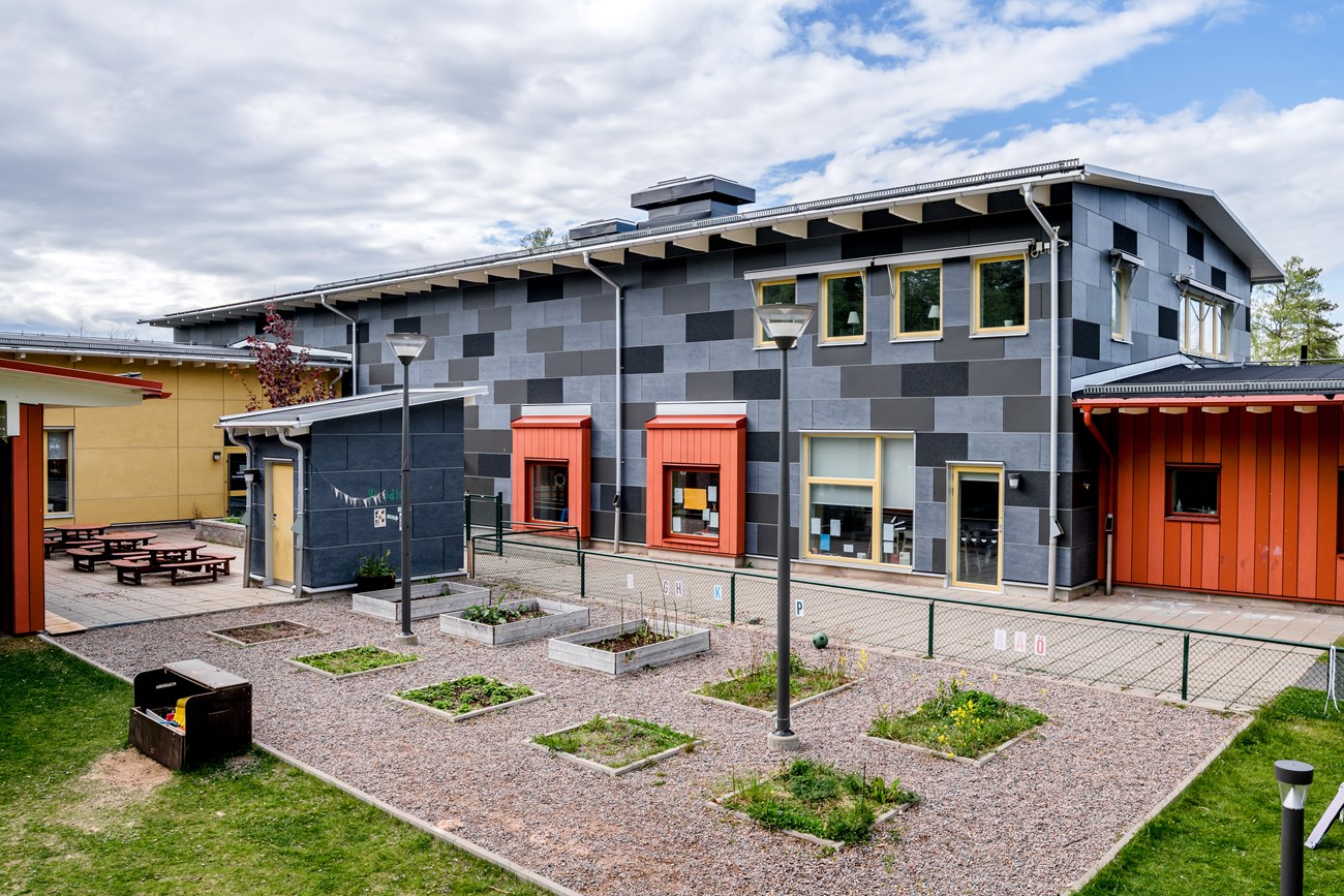 I anslutning till förskolan anläggs en ny utemiljö med lekplatser och fristående kallförråd för lekutrustning, parkering och angöring samt miljöstation till förskola och kök. Förskolan har fem avdelningar.